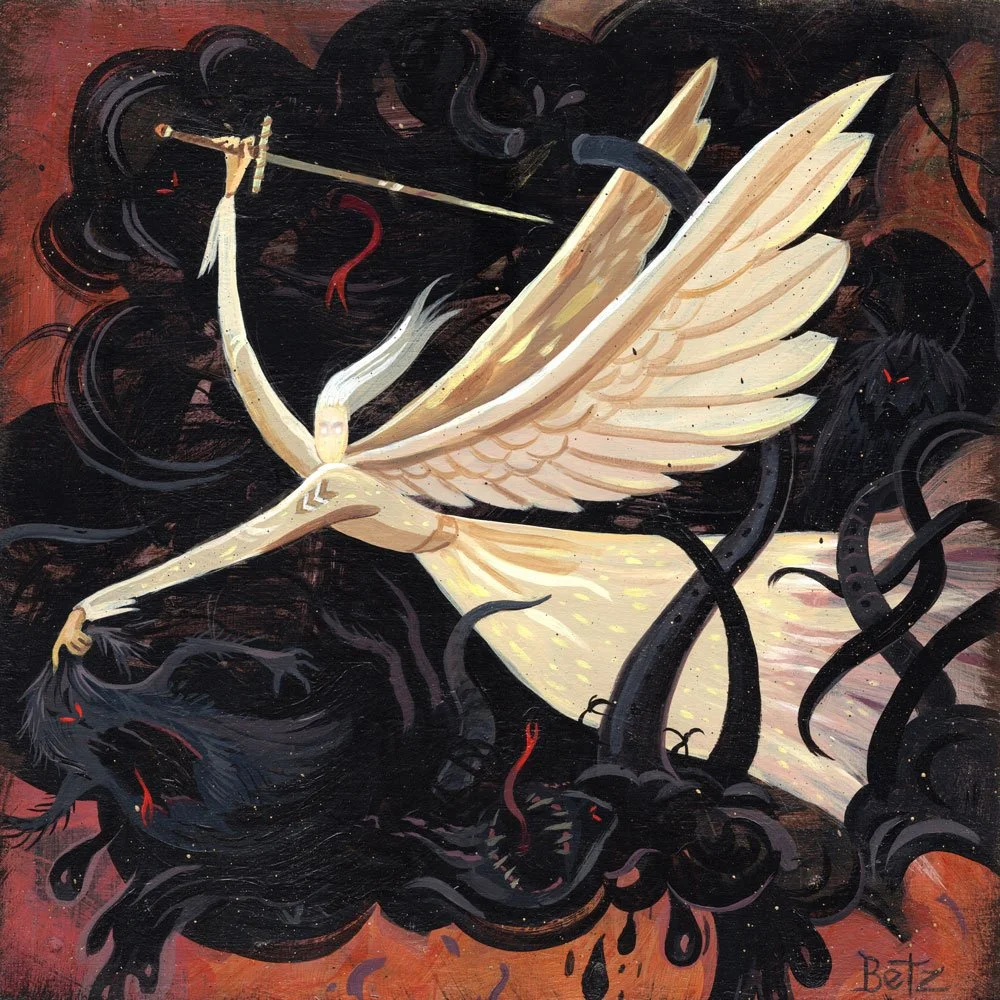 Gleaning inspiration from such words, these paintings depict my vision of the spiritual battle for the soul of America, to remind us there is hope. Angels are on the side of freedom and are fighting for us. And the light shines in the darkness, and the darkness can never extinguish it.